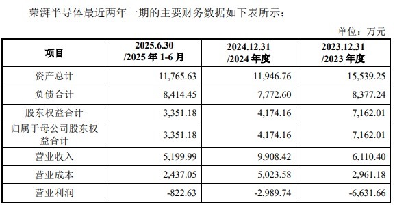 2023年度、2024年度、2025年上半年,荣湃半导体营业收入分别为6,110.40万元、9,908.42万元、5,199.99万元,净利润/归属于母公司股东的净利润分别为-6,631.96万元、-2,989.74万元、-822.99万元。