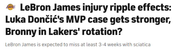 安泰证券 美媒解析詹姆斯缺阵影响: 东契奇冲MVP更有戏? 布朗尼上场时间或增加