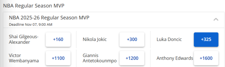 最新MVP赔率显示安泰证券,东契奇是+325,暂列第三,但已经非常接近第二的约基奇(+300),而亚历山大(+160)目前排在榜首。