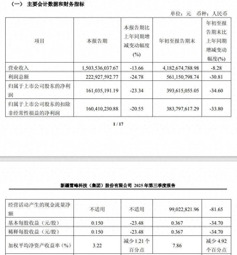 10月20日,雪峰科技(603227)公布2025年三季报,公司营业收入为41.8亿元,同比下降8.3%;归母净利润为3.94亿元优配好油,同比下降34.6%;扣非归母净利润为3.84亿元,同比下降33.8%;经营现金流净额为9902万元,同比下降81.7%;EPS(全面摊薄)为0.3673元。